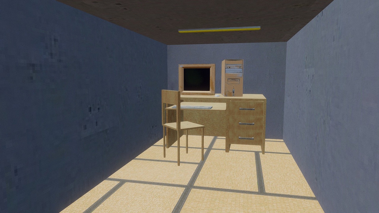 A basic, low-fidelity 3D model of a small, windowless room interior. It features essential furniture, including a wooden desk and chair, and an older-style computer with a boxy monitor and a Tube light. The floor is all Tatami mat, inspired from japanese Small Cyber Cafe’s.