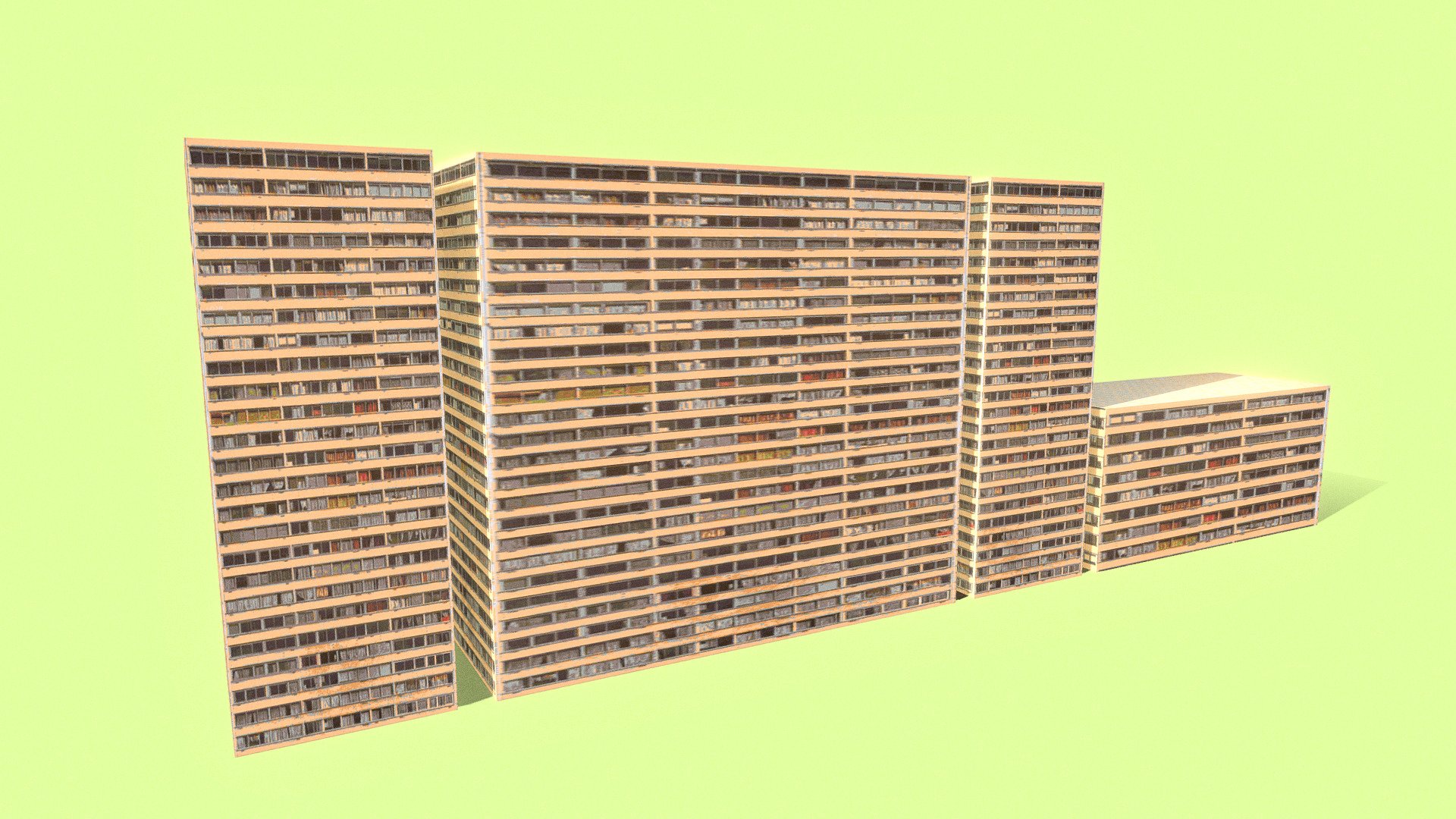 A large-scale low-poly 3D model representing a cluster of Brutalist mass housing blocks with uniform facades. The model includes variations in height, featuring a long, low block connected to taller towers. The texture depicts a beige or light brown exterior with hundreds of densely packed, repetitive windows, emphasizing the monolithic and overwhelming nature of the architecture. This asset is ideal for creating dense urban filler, dystopian cityscapes, or brutalist architectural visualizations.
